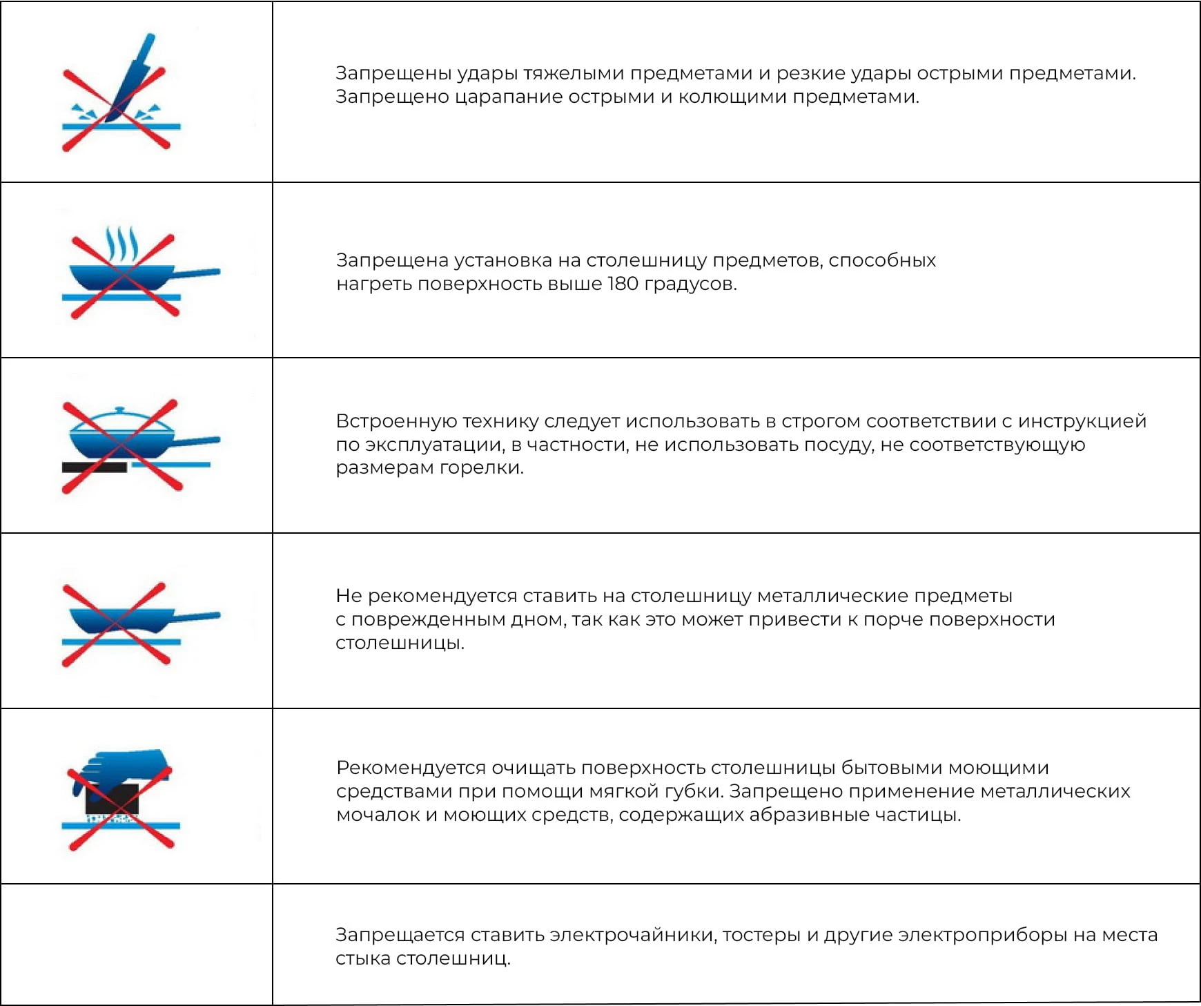 Запрещается ставить на столешницу предметы, способные нагреть ее поверхность выше 180 градусов. Длительное воздействие высоких температур может привести к деформации изделия.