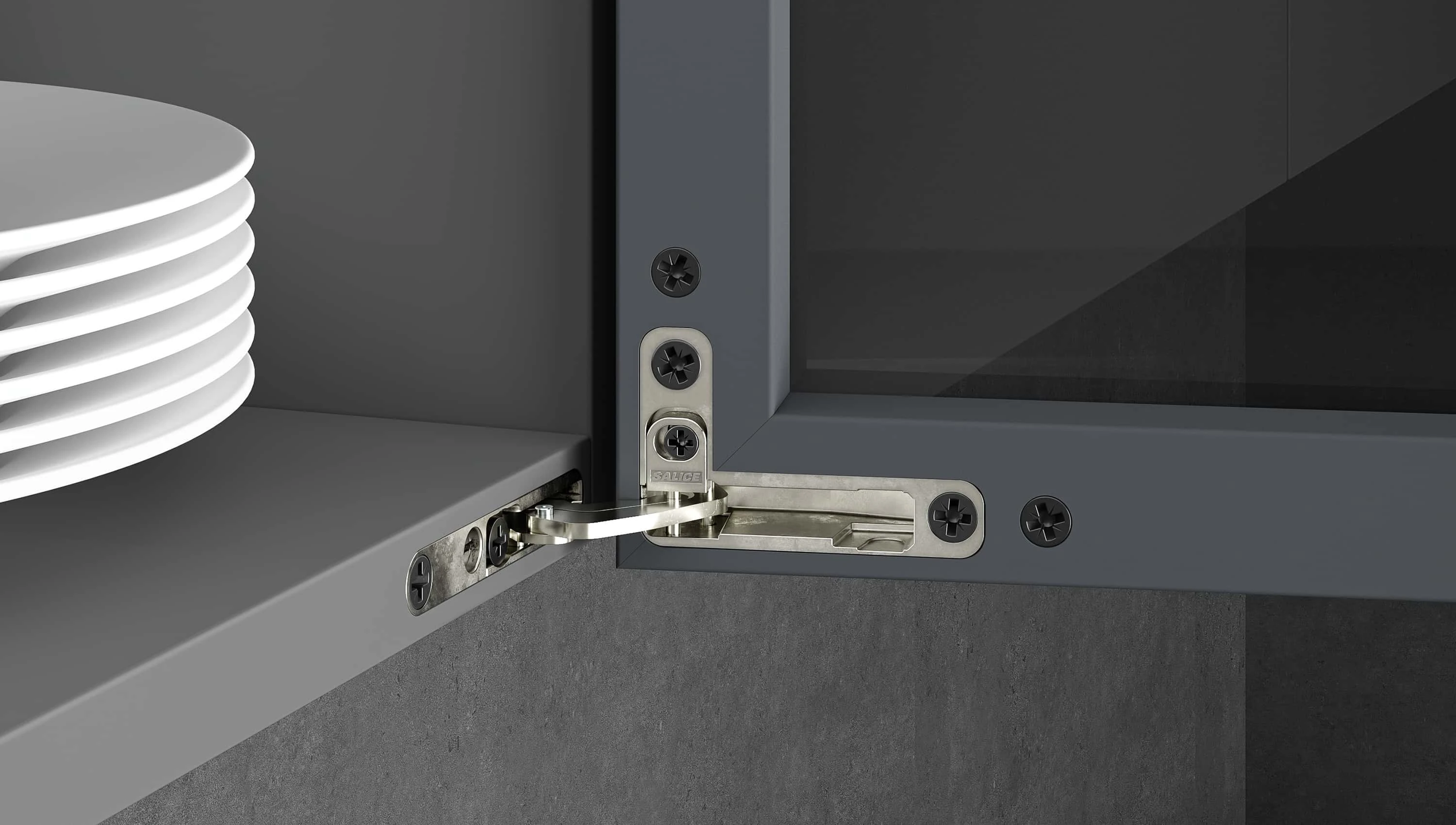 Скрытая петля из коллекции AIR от итальянского производителя Salice встраивается в верхнюю и нижнюю панель корпуса шкафа, а также в фасад, что делает ее практически незаметной.
