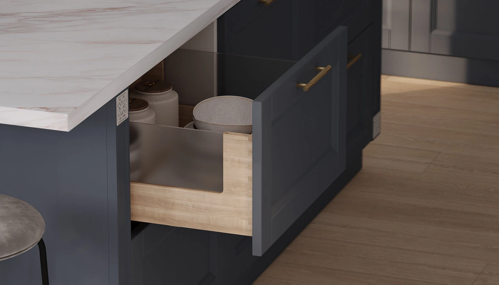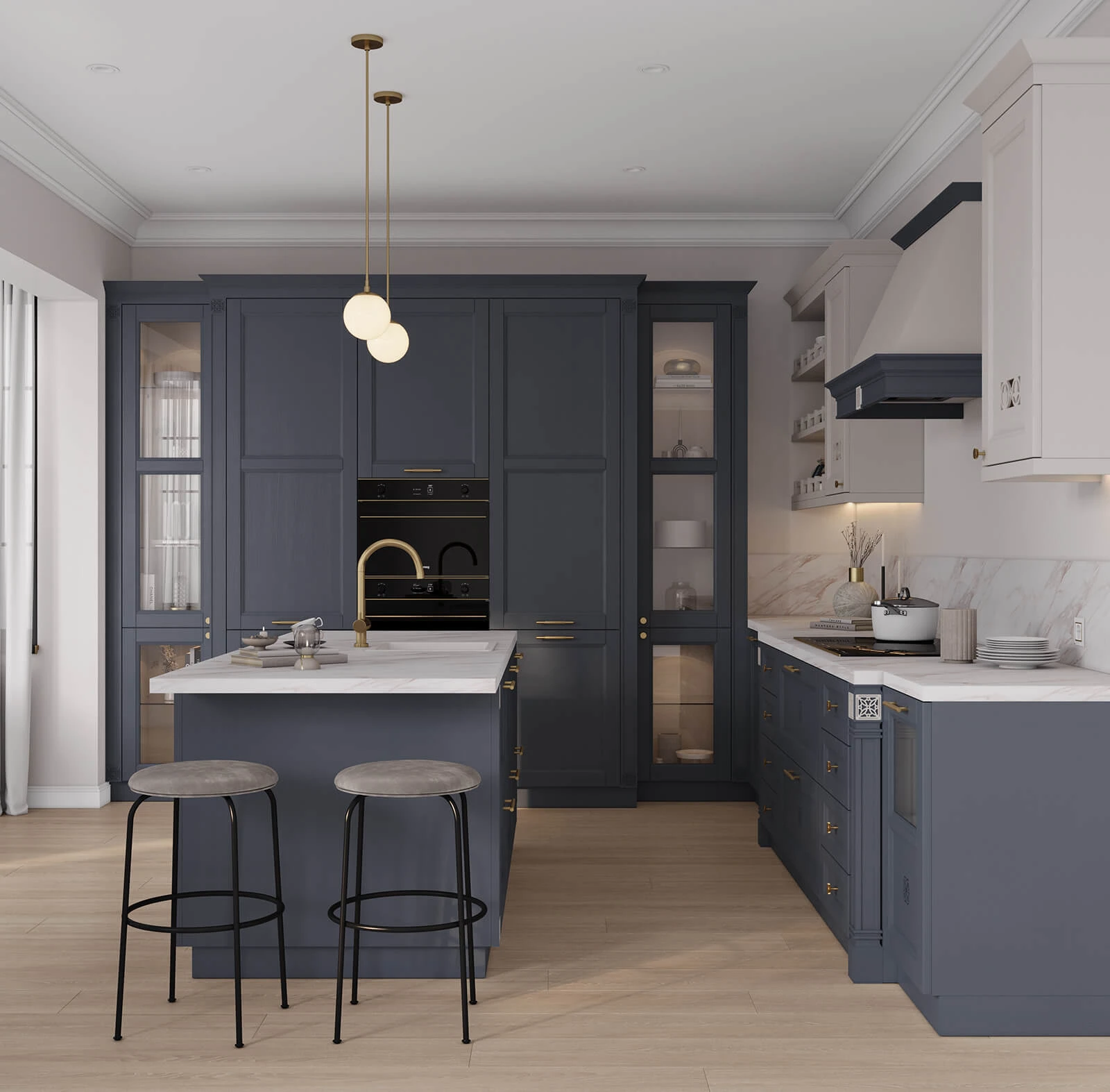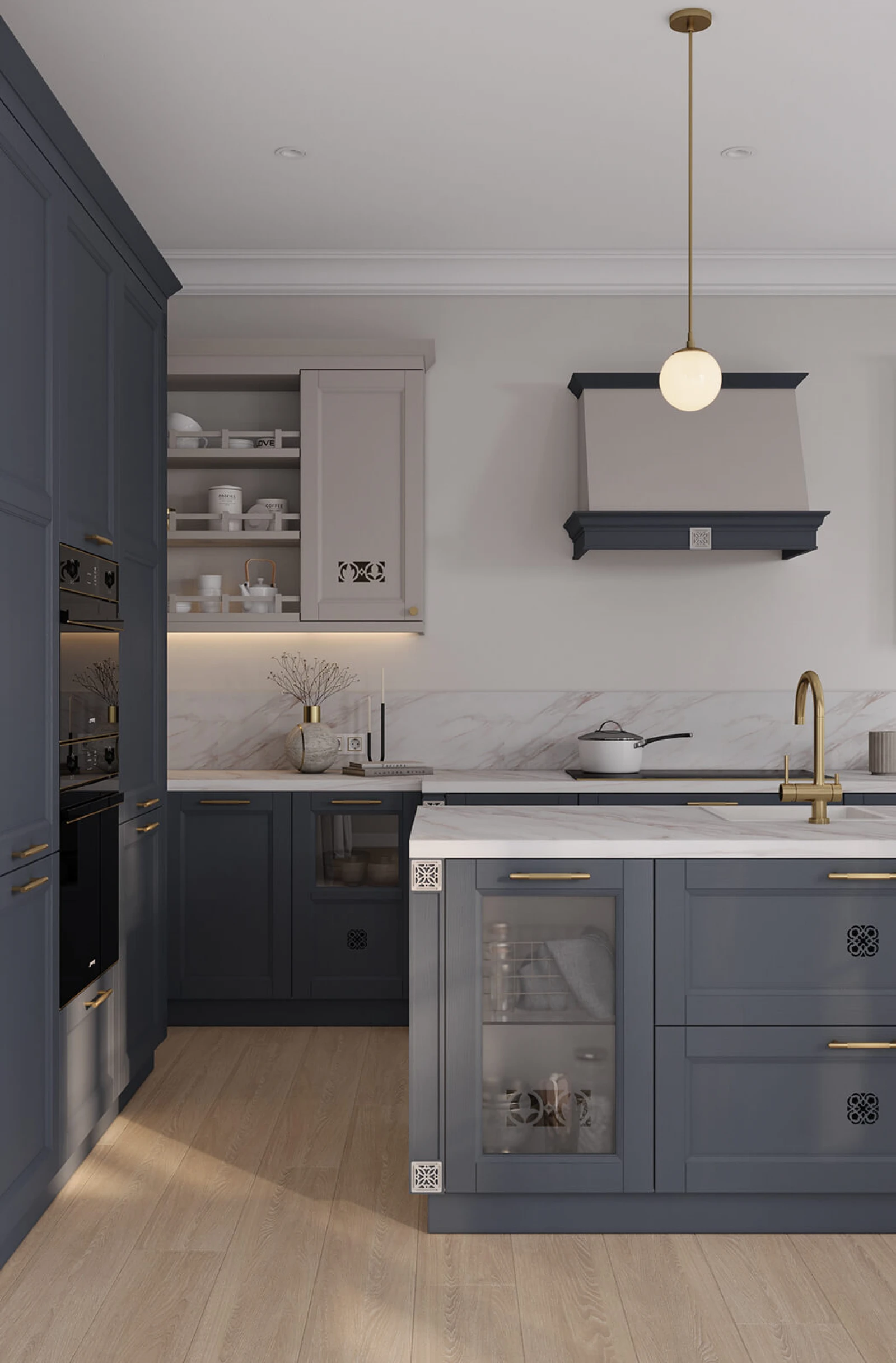 Dekorative Stütze OD-10(820); Pilaster #12, 13; gerade Balustrade «Techno»; Zierprofil PM-6; Kranzprofil LGB-1 gerade; Dekorverkleidung NV «Piedmont» (700) für eingebaute Dunstabzugshaube