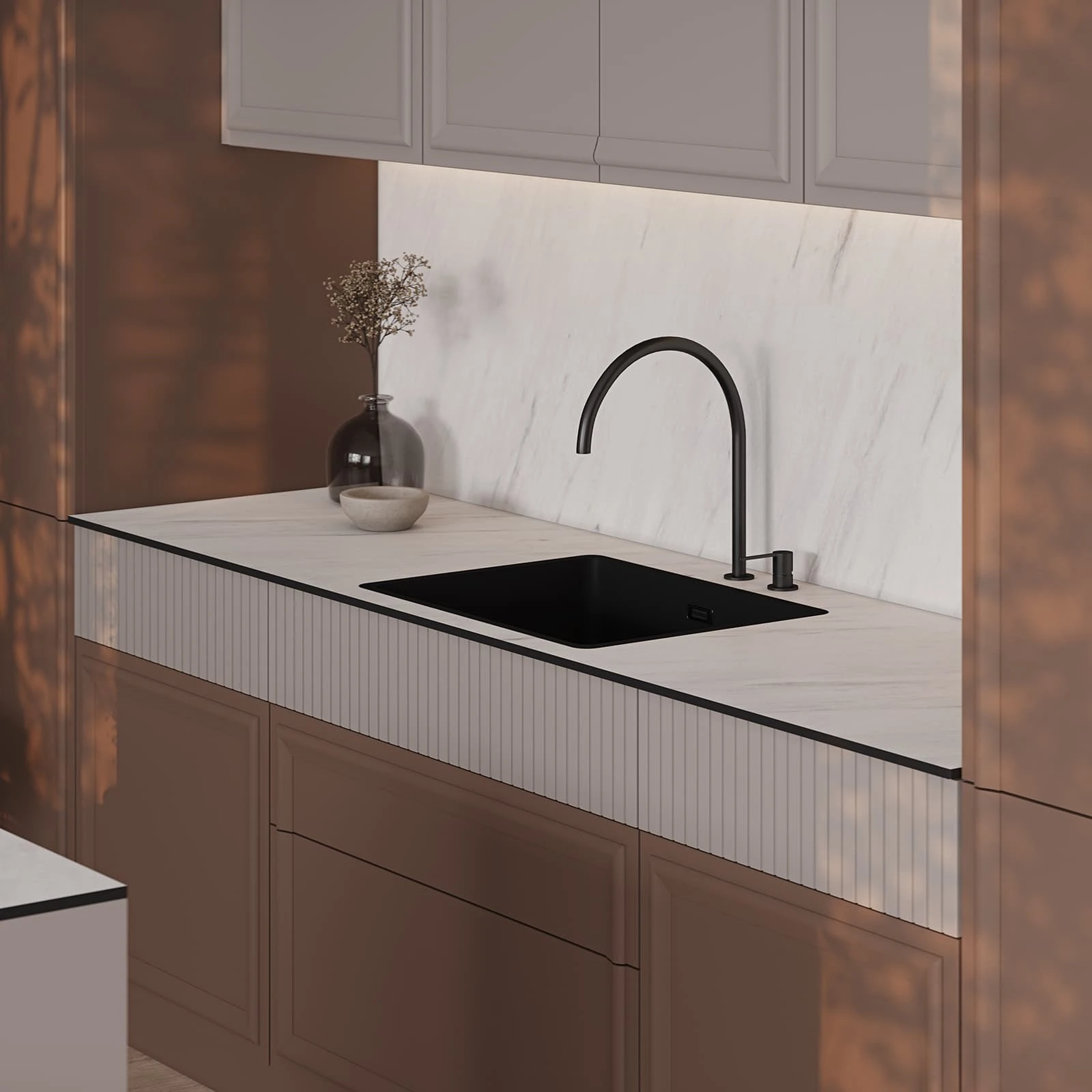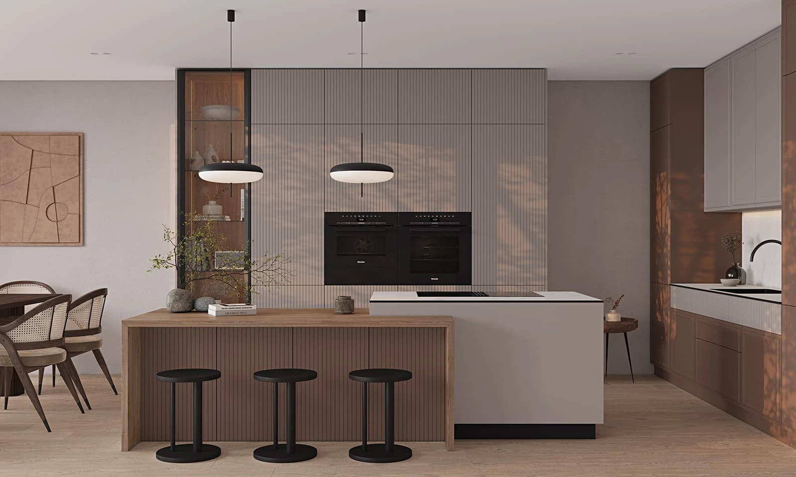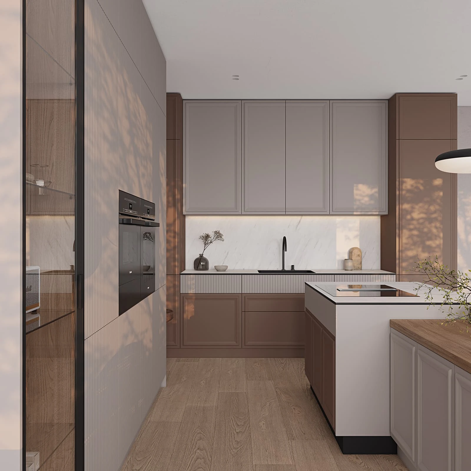 FRONTY T682 Płyta MDF lakierowana, kolor NCS S 2500-N Matowy / NCS S 6010-Y70R Matowy; T651 Płyta MDF lakierowana, kolor NCS S 2500-N Matowy / NCS S 6010-Y70R Matowy BLAT KUCHENNY Płyta kompaktowa, 12 mm / KS lite drewno dębu, 38 mm, kolor #181 (wosk Orzech)