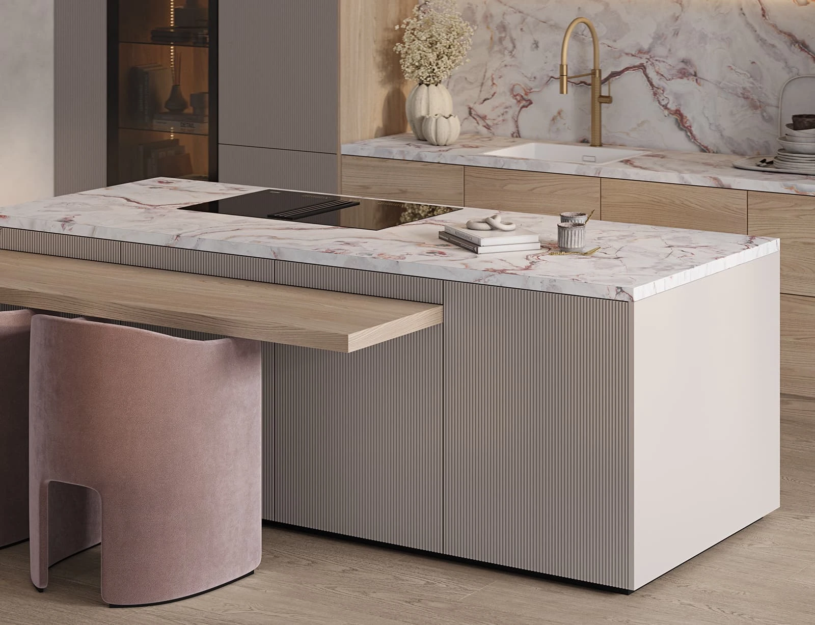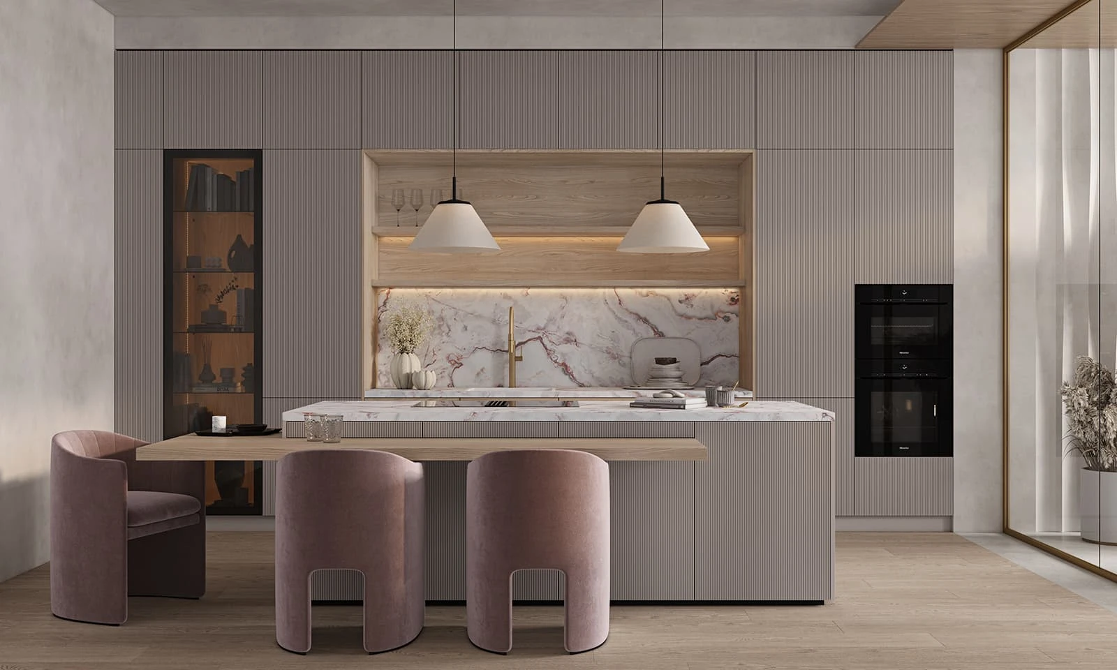 ФАСАДЫ Т645 Крашеная МДФ, цвет NCS S 2000-N Матовый / Т419Г Шпон дуба, цвет #189 (воскобейц Белый) СТОЛЕШНИЦА Пластик HPL, 38 мм, декор Версаль / КС массив дуба, 38 мм, цвет #189 (воскобейц Белый)