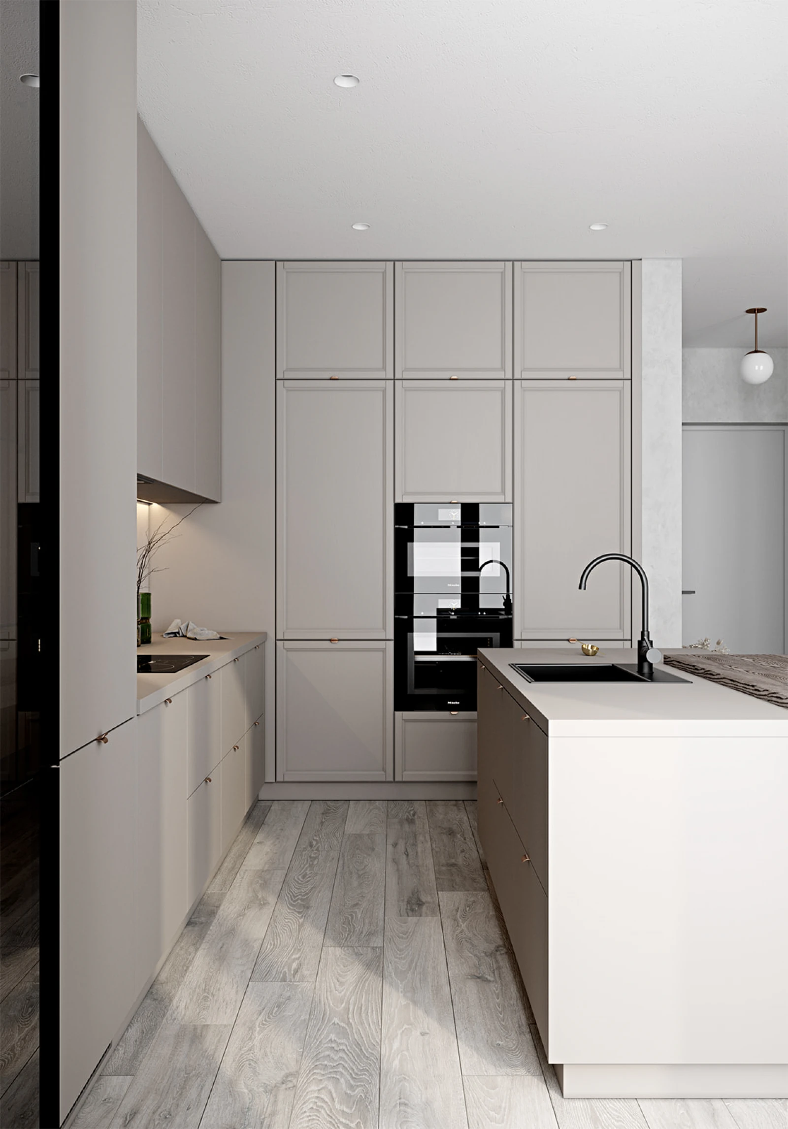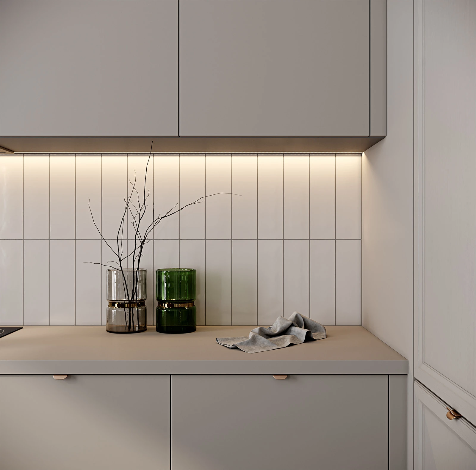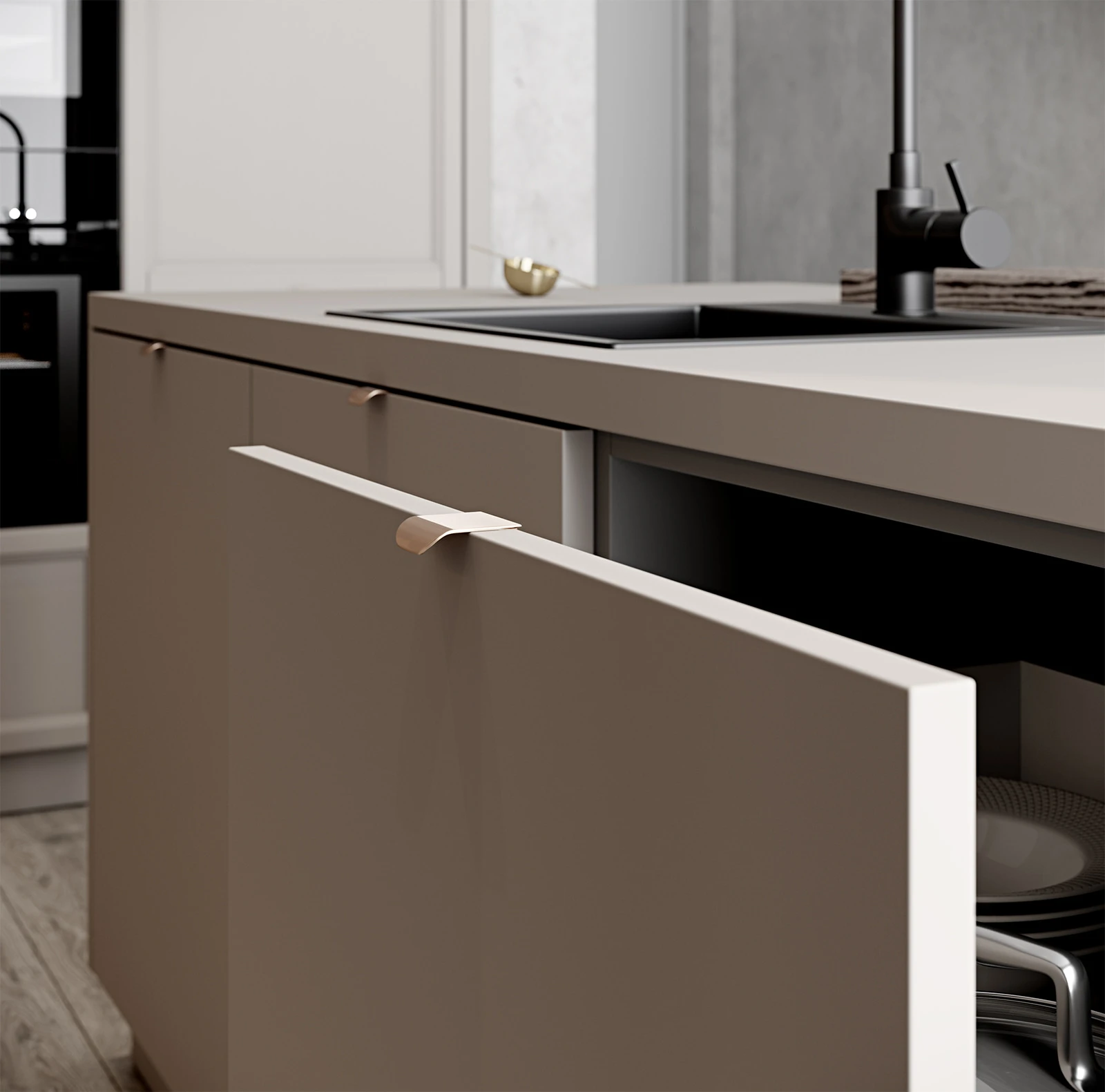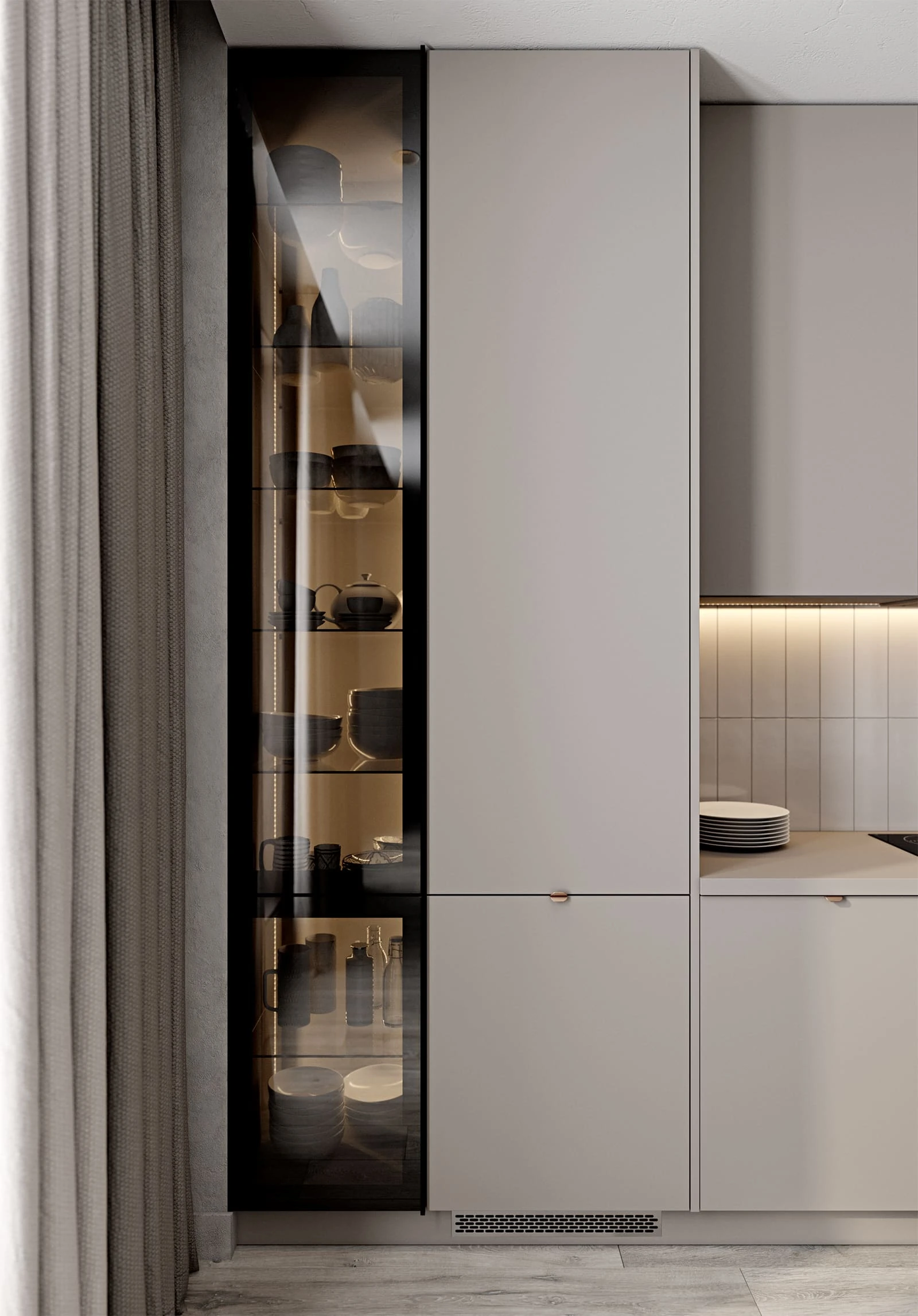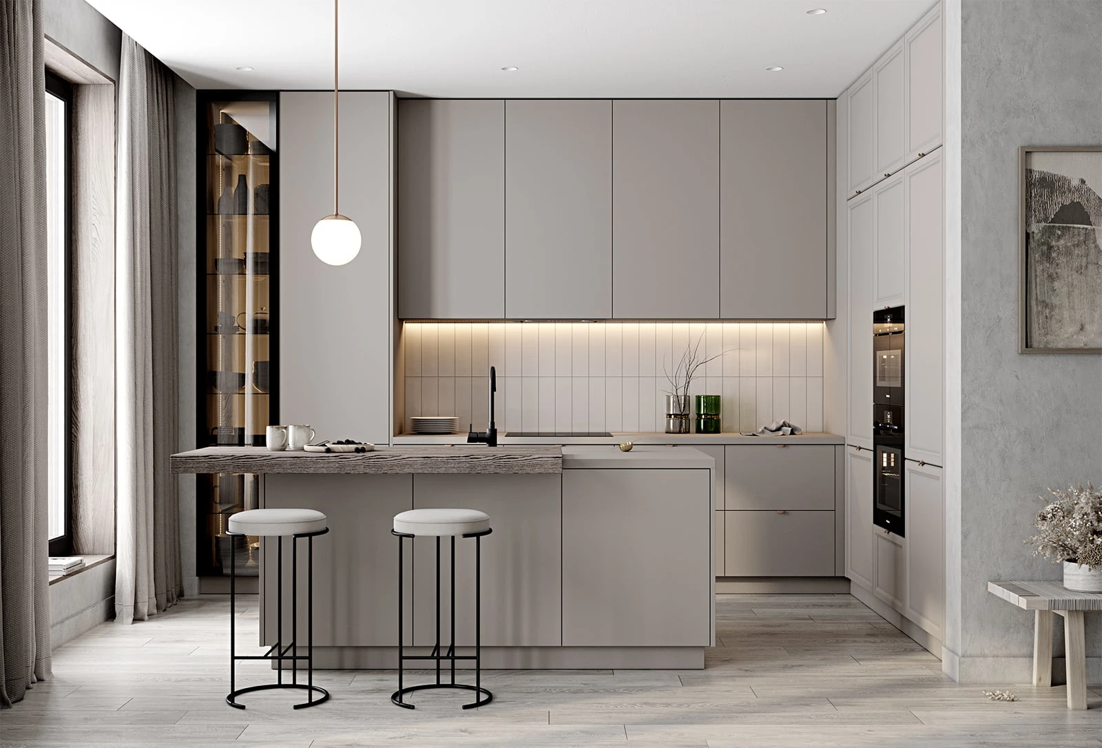 ФАСАДЫ Акрил Fenix NTM, цвет Серо-бежевый NTM (0748) / Т727 Натуральный дуб, цвет NCS S 3005-Y50R СТОЛЕШНИЦА Акрил Fenix NTM, 38 мм, цвет Серо-бежевый NTM (0748); МДФ/шпон ясеня, 70 мм, цвет #187 (масловоск Мореный Дуб)